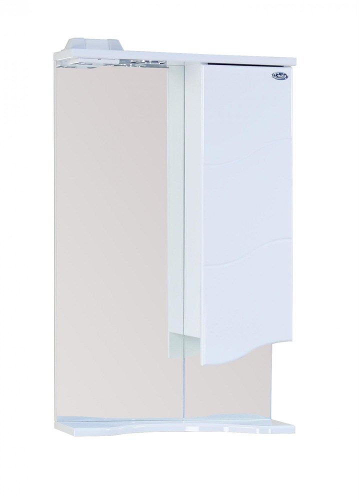 Справа от зеркала за распашной фигурной дверцей с изящной фрезеровкой и механизмом плавного закрывания расположено отделение для хранения, разделенное на две части горизонтальной полочкой, под зеркалом - открытая полочка для косметических средств или декоративных элементов.