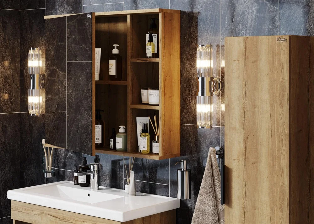 Зеркальный шкаф Onika ЛЕГРАН 80.00У - это сочетание насыщенного древесного декора и благородства металла: роскошная текстура и натуральный цвет дуба дают теплоту, а матовая металлическая ручка добавляет урбанизма и солидности.