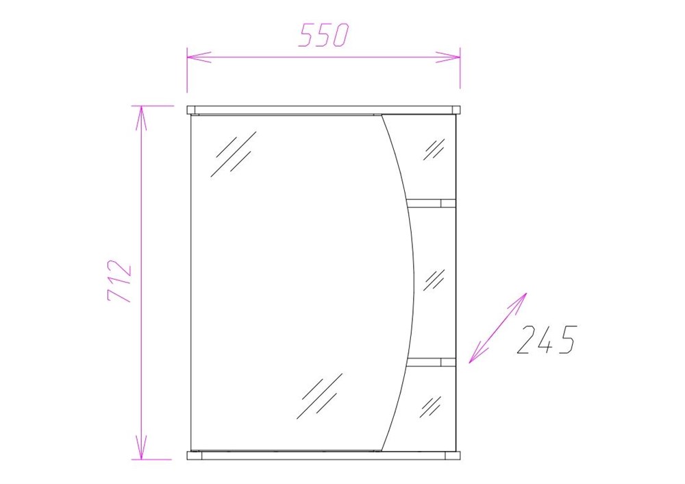 Справа за распашной зеркальной дверцей с механизмом плавного закрывания расположено вместительное отделение для хранения, разделенное на 3 части горизонтальными полочками, справа - 3 открытые полочки для косметических средств или декоративных элементов.