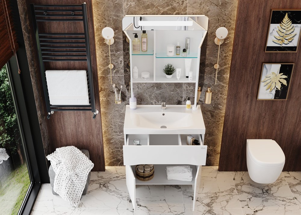 Дверца с механизмом плавного закрывания - она же зеркальный фасад со скошенными углами и светодиодной подсветкой, скрывает вместительное пространство для хранения, разделенное стеклянными полочками с еврокромкой.