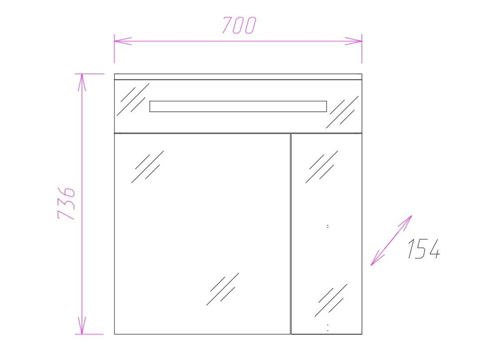 Внешне это отражается в лаконичной прямоугольной форме без ручек и лишнего декора и стильной люминесцентной подсветке, в функционально - в двух дверцах разного размера с механизмом плавного закрывания, скрывающих просторное пространство для хранения необходимых вещей, разделенное на 3 части стеклянными полочками с еврокромкой.