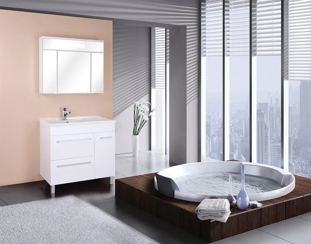 Внешне это отражается в лаконичной прямоугольной форме без ручек и лишнего декора и стильной люминесцентной подсветке, в функционально - в двух дверцах разного размера с механизмом плавного закрывания, скрывающих просторное пространство для хранения необходимых вещей, разделенное на 3 части стеклянными полочками с еврокромкой.