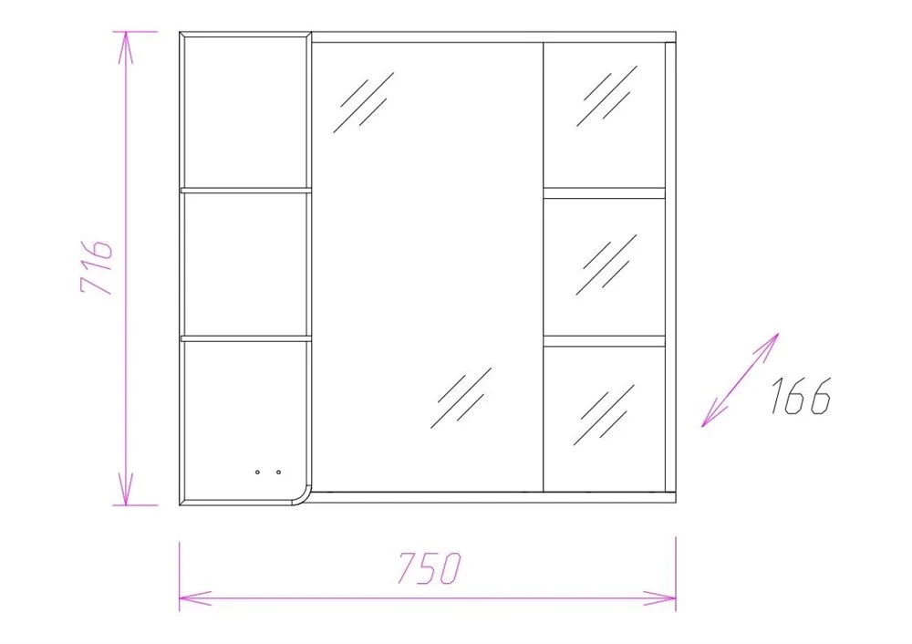 Слева от зеркала за распашной дверцей с неброской горизонтальной фрезеровкой и механизмом плавного закрывания, расположено отделение для хранения, разделенное на три части горизонтальными полочками, Справа от зеркала и под ним - открытые полочки для косметических средств или декоративных элементов.
