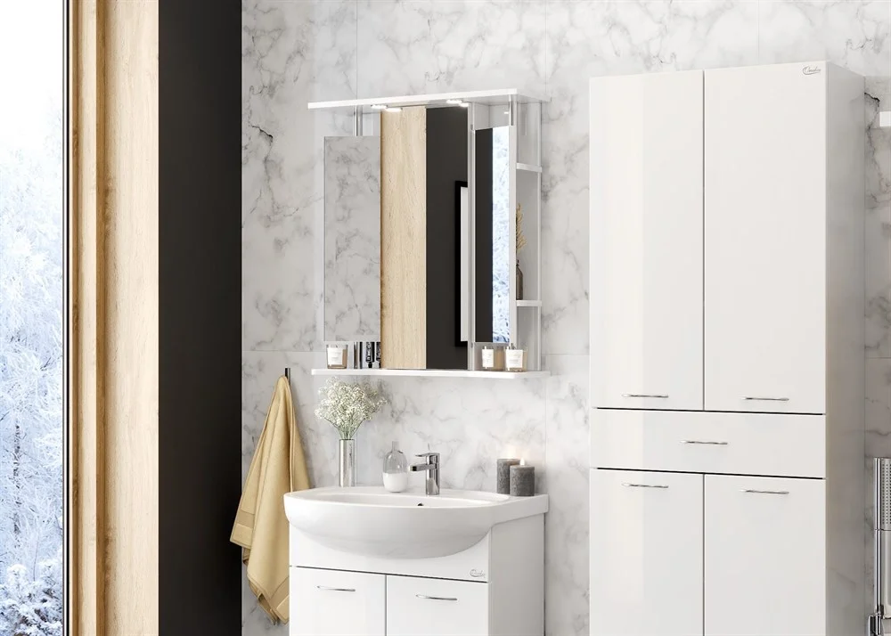Неординарный дизайн и обилие разнообразного пространства для хранения - отличительная особенность зеркального шкафа Onika ВАЛЕРИЯ 65.02.