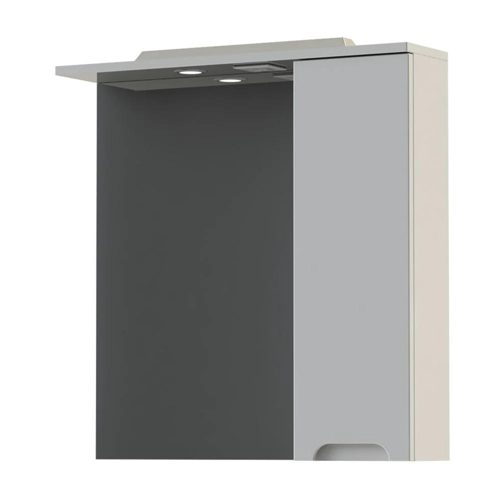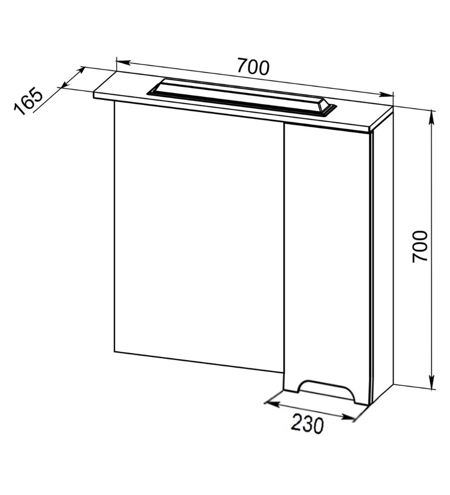 Зеркало со шкафчиком с правой стороны. Фасад зеркальное полотно, МДФ 16 мм в эмали (белый глянец, производство - Италия). Корпус ЛМДФ 16 мм. Дверца с механизмом плавного доведения. Розетка и выключатель со встроенным светильником LED (4W), две стеклянные полочки. Навесы усиленные с планкой.