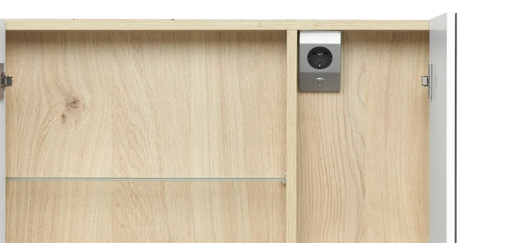 Зеркальный шкаф Up в современном стиле от испанского бренда Roca, выполненный из высококачественной влагостойкой ЛДСП, с LED-подсветкой, сенсорным выключателем с диммером, розеткой, регулируемыми по высоте стеклянными полочками и петлями с плавным доводом.