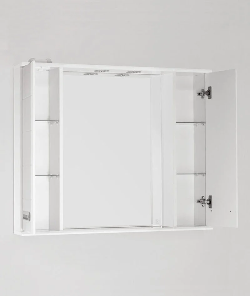 Зеркальный шкаф Style Line коллекции "Ирис" с подсветкой и прямоугольными фасадами современного дизайна, декорированный врезными ручками хром/матовый хром. Фацет на зеркале; стеклянные полки с еврокромкой и прозрачными полкодержателями Hefele; лазерная гравировка фирменного логотипа; встроенные светильники в шкафах комплектуются выключателем, розеткой и трансформатором. Высокоточная обработка кромки фацетом 10 мм придает изделию законченный вид и защищает от порезов