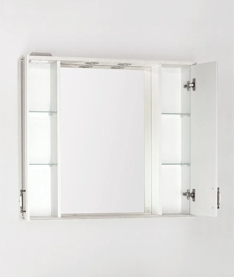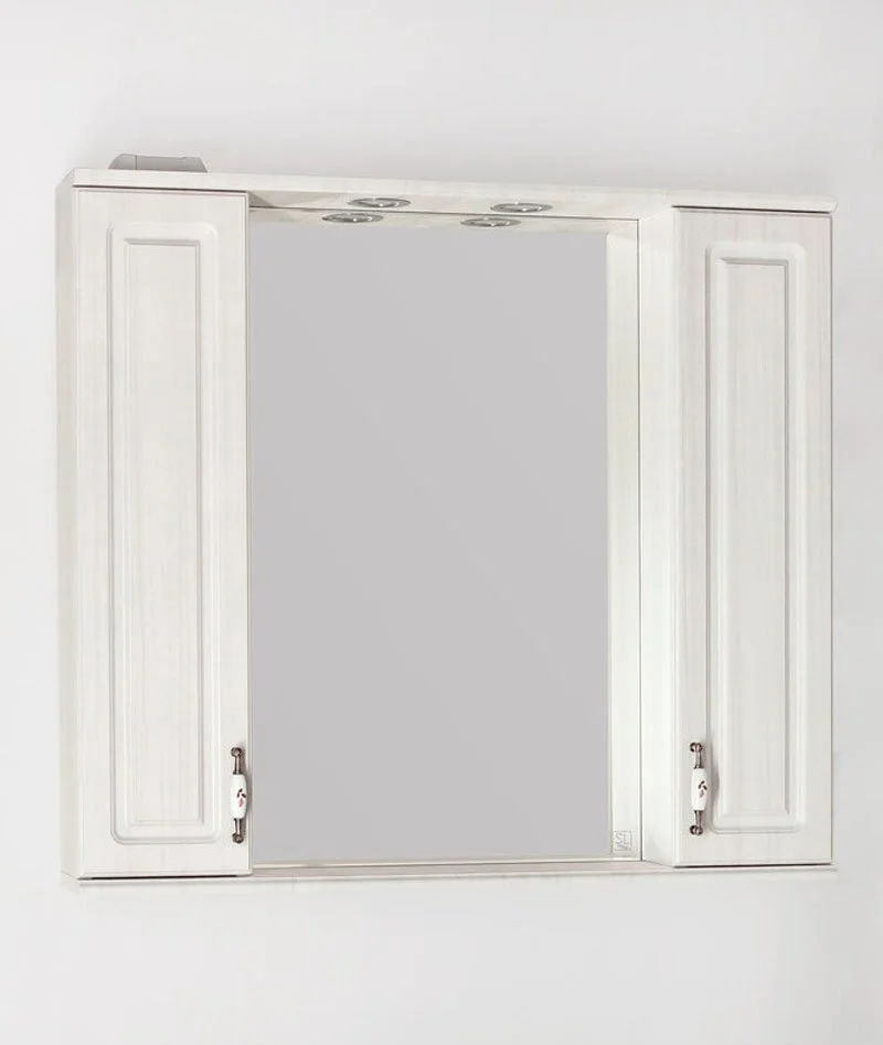 Зеркальный шкаф Style Lineколлекции "Олеандр-2" с подсветкой классического дизайна, декорированный ручками с керамическими вставками "под бронзу" с изящным рисунком. Стеклянные полки с еврокромкой и прозрачными полкодержателями Hefele; лазерная гравировка фирменного логотипа; встроенные светильники в шкафах комплектуются выключателем, розеткой и трансформатором. Высокоточная обработка кромки фацетом 10 мм придает изделию законченный вид и защищает от порезов