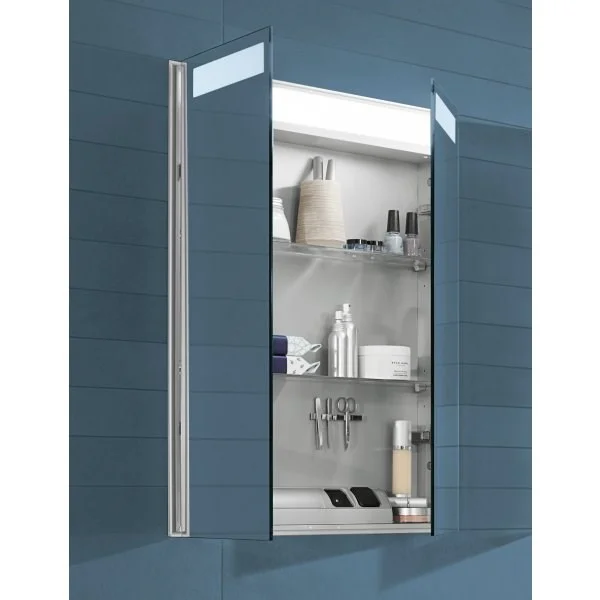 Зеркальный шкаф с подсветкой и практичным внутренним оснащением.