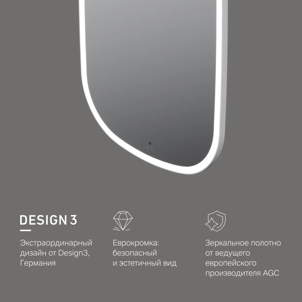 Зеркало изготовлено из зеркального полотна от ведущего европейского производителя зеркал AGC. Изделие имеет высокую степень защиты от попадания капель воды брызг. Край зеркального полотна обработан еврокромкой что обеспечивает надежную защиту от случайных порезов при контакте с изделием.