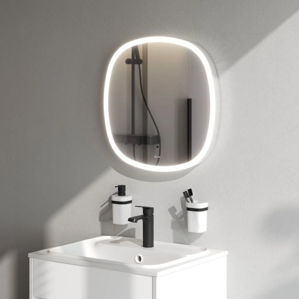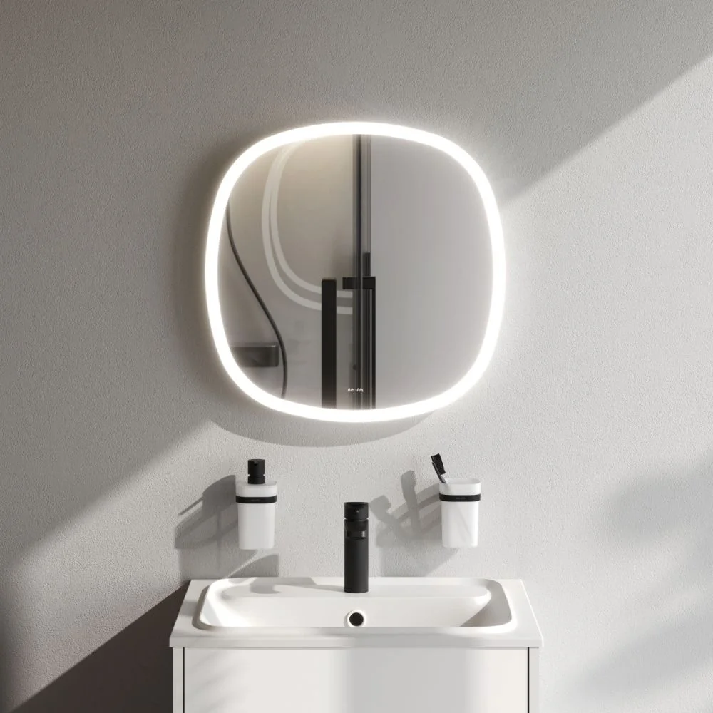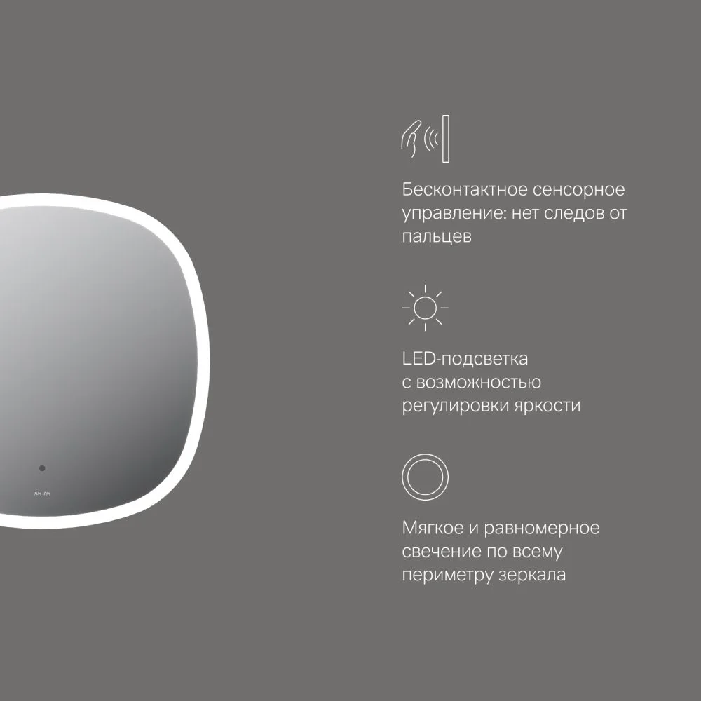 В качестве элемента LED-подсветки используется светодиодная лента которая создает мягкое и равномерное свечение по периметру всего зеркала. Управление подсветкой осуществляется при помощи бесконтактного сенсора. Сенсор нового поколения позволяет управлять включением/выключением и яркостью LED-подсветки без касания зеркального полотна. Зеркало дольше остается чистым. Зеркало поставляется в
