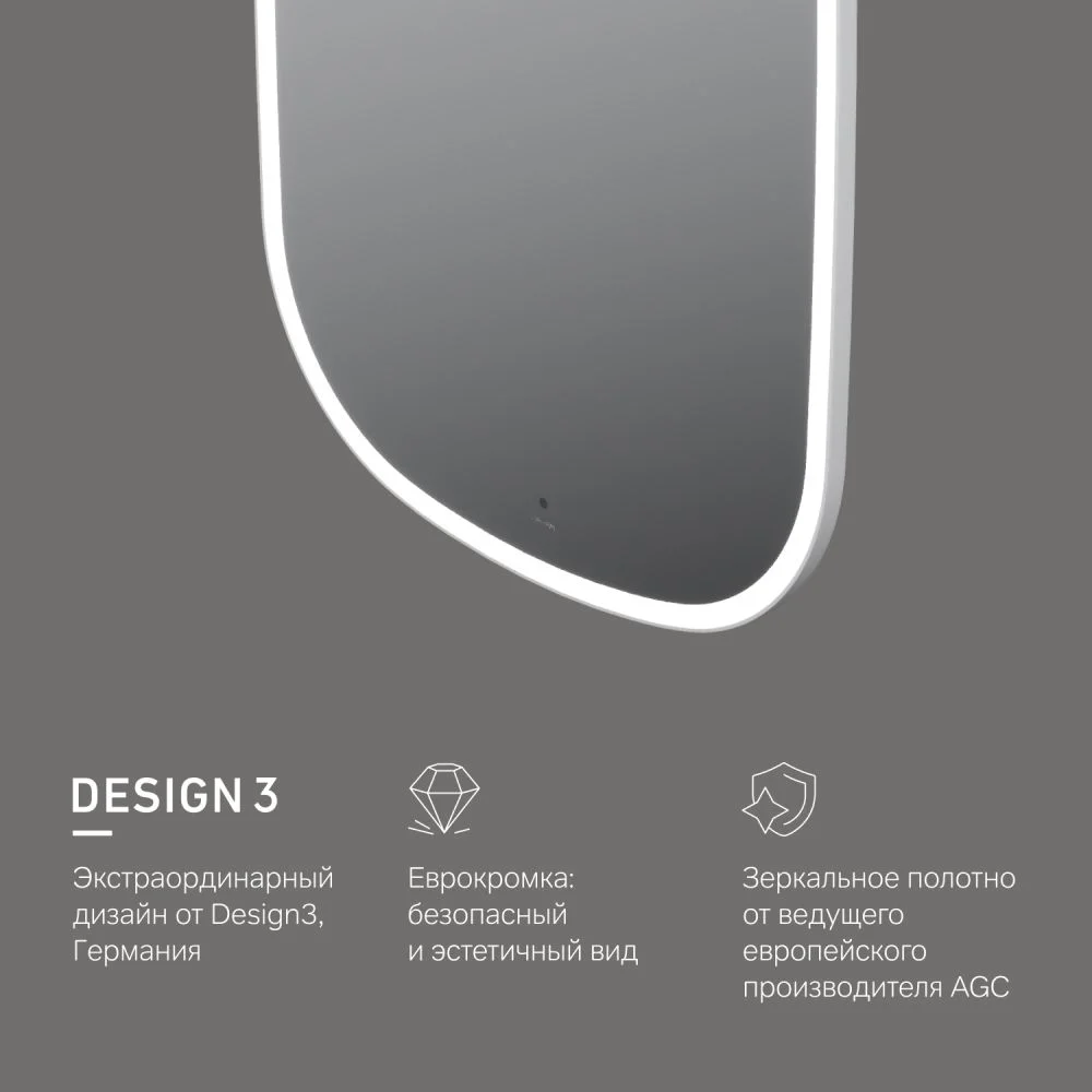 Зеркало изготовлено из зеркального полотна от ведущего европейского производителя зеркал AGC. Изделие имеет высокую степень защиты от попадания капель воды брызг. Край зеркального полотна обработан еврокромкой что обеспечивает надежную защиту от случайных порезов при контакте с изделием.