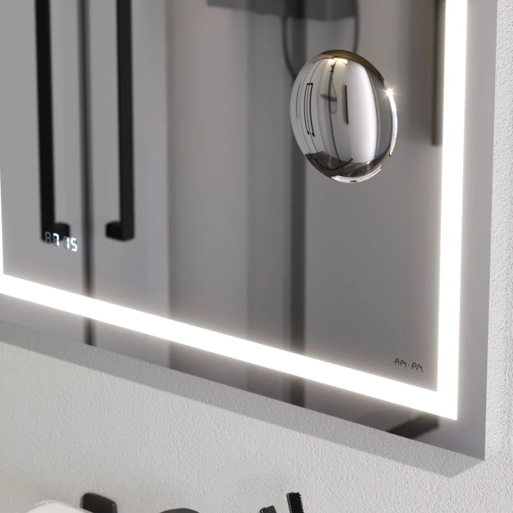 Ультрамодный лаконичный дизайн зеркал Gem от собственной студии дизайна AM.PM Design подойдет к интерьеру любой ванной комнаты. Премиальный функционал в коллекции доступного ценового сегмента: встроенное косметическое зеркало увеличивающее изображение и часы прямо под стеклом - всегда на виду.