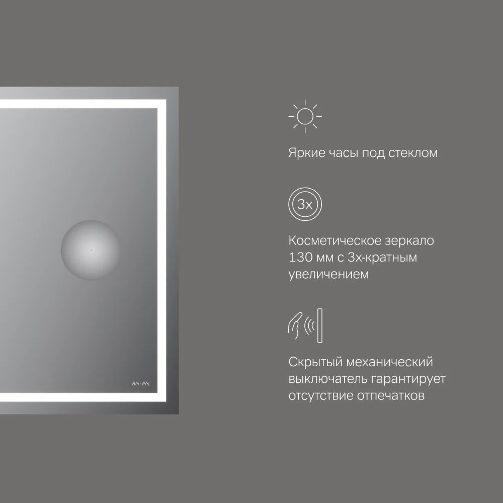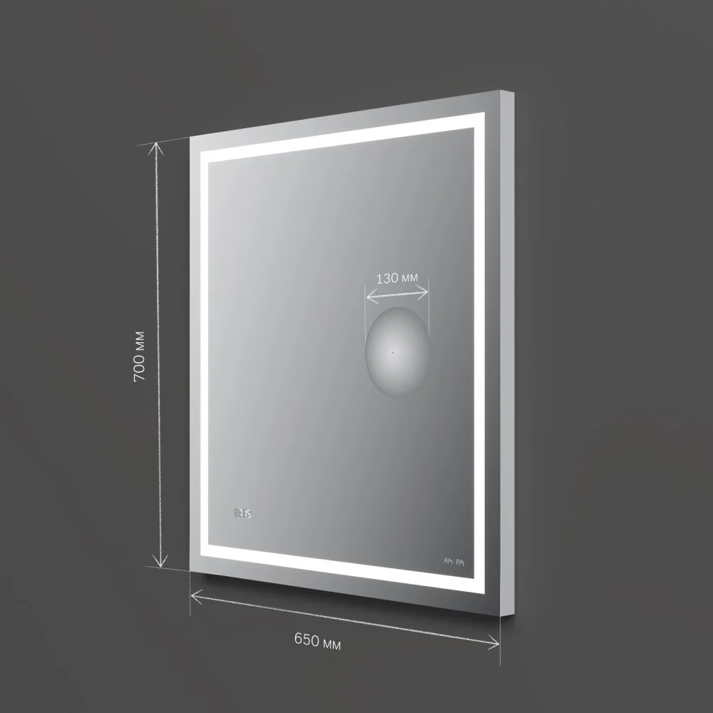 Скрытый механический выключатель сохраняет эстетическую целостность дизайна зеркала а также гарантирует отсутствие отпечатков пальцев на зеркальном полотне. Зеркальное полотно премиального качества производства Бельгии. Гарантия 3 года. ""