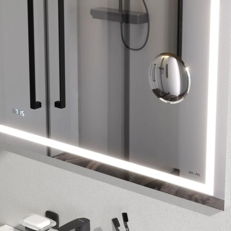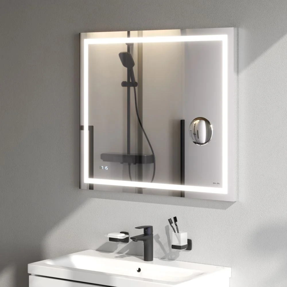 Ультрамодный лаконичный дизайн зеркал Gem от собственной студии дизайна AM.PM Design подойдет к интерьеру любой ванной комнаты. Премиальный функционал в коллекции доступного ценового сегмента: встроенное косметическое зеркало увеличивающее изображение и часы прямо под стеклом - всегда на виду.