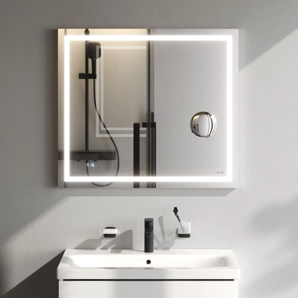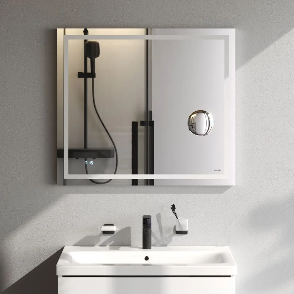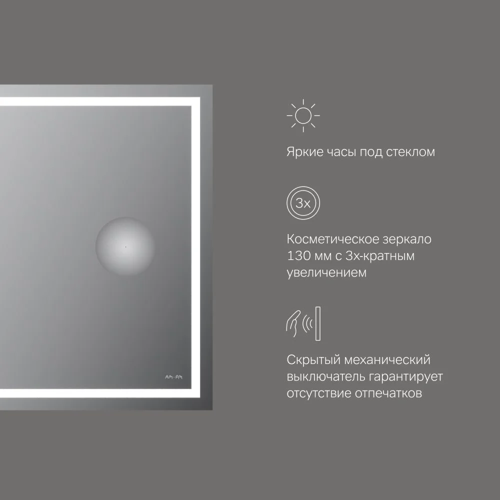 Скрытый механический выключатель сохраняет эстетическую целостность дизайна зеркала а также гарантирует отсутствие отпечатков пальцев на зеркальном полотне.