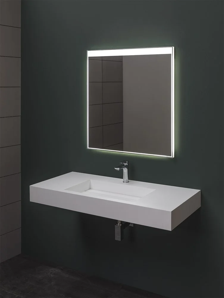 Зеркало Aquanet Палермо 8085 LED имеет универсальную установку. Тоненькая светящаяся полоска по всему периметру этого четырехугольного зеркала – LED-светильник. В верхней части она перетекает в широкую рамку. Зеркало размером 80х85 будет симпатично смотреться в ванной и зрительно увеличит размер маленького помещения. Оно будет выглядеть единым комплектом с тумбой шириной 80 см. Включение и выключение светильника происходит с помощью инфракрасного датчика, а он расположен в нижней части зеркала, то есть на той стороне, которая находится напротив широкой светящейся полосы. <