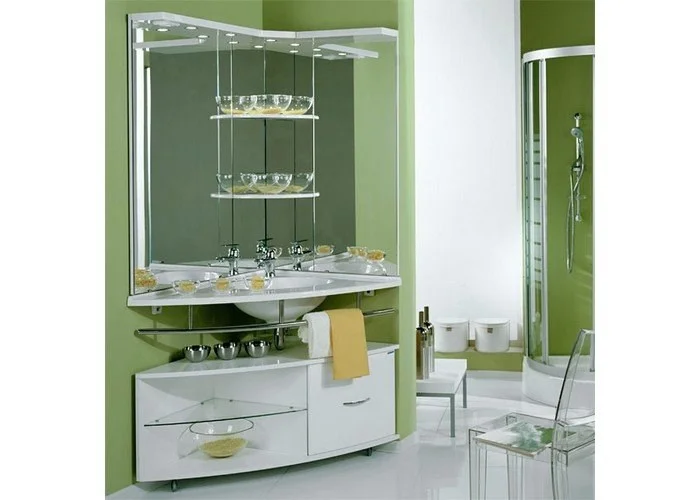 Большое угловое зеркало оснащено верхней панелью с декоративной подсветкой.