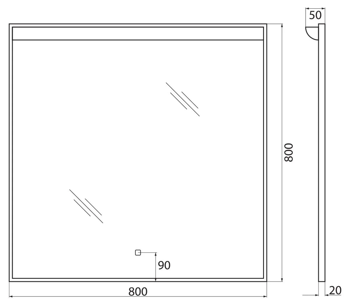Зеркало 800x20x800 4мм прямоугольное. Корпус изделия выполнен из алюминиевого профиля, с подсветкой. С сенсорным выключателем. Крепеж для навески прилагается.