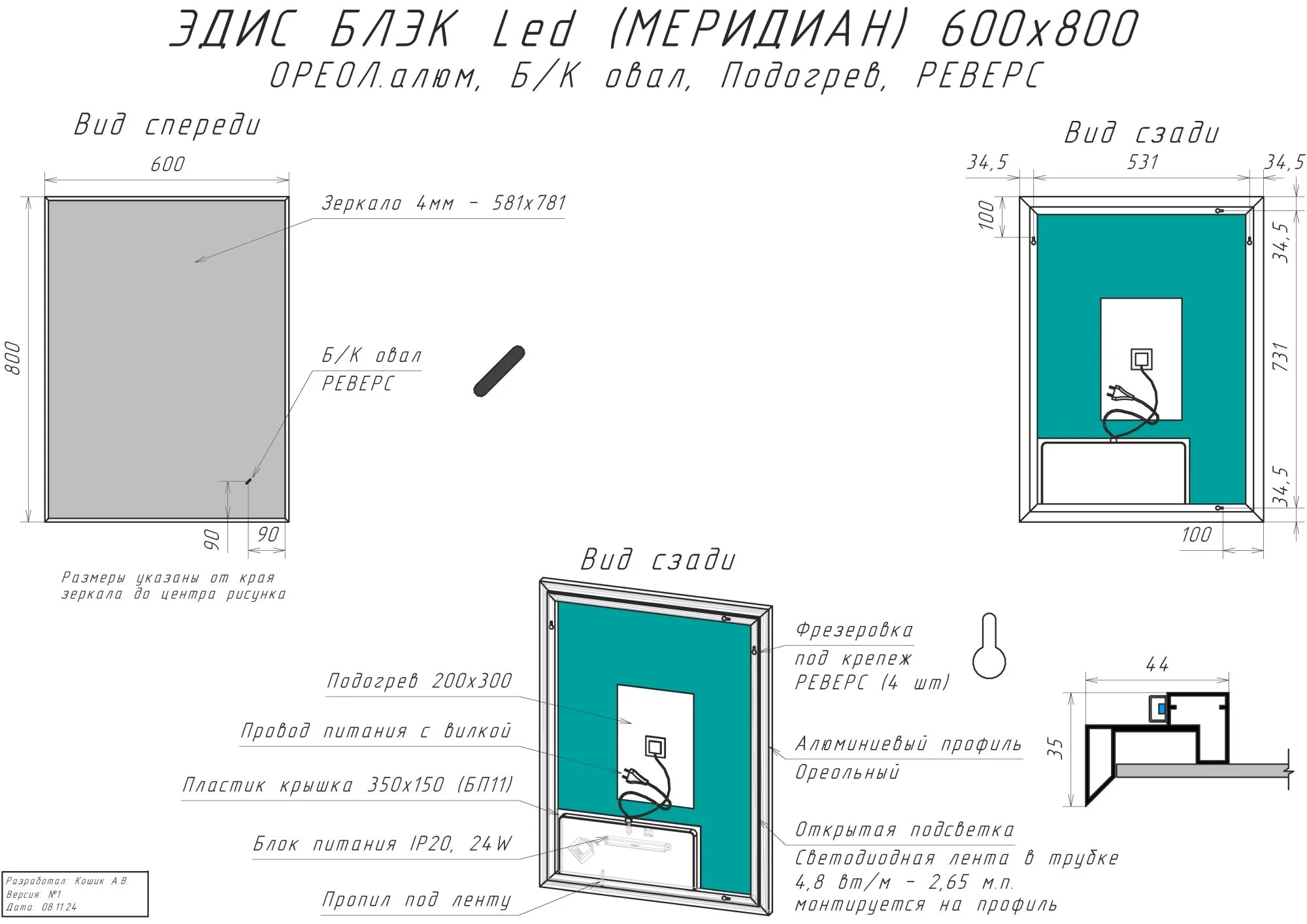 Led-зеркало с функцией подогрева, 1 матовый Бесконтактный датчик вкл/выкл. Быстрый монтаж.
