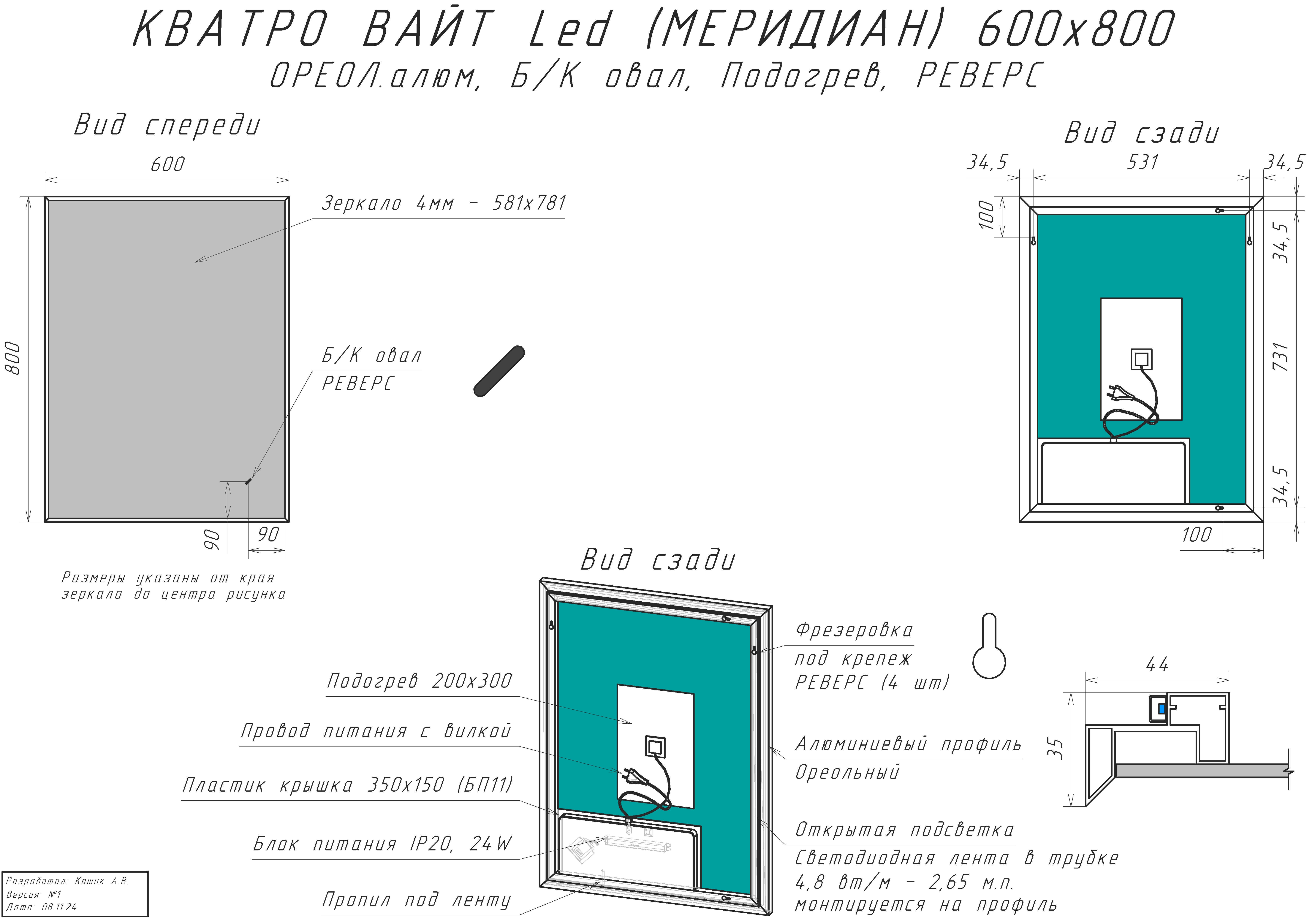 Led-зеркало с функцией подогрева, 1 матовый Бесконтактный датчик вкл/выкл. Быстрый монтаж.