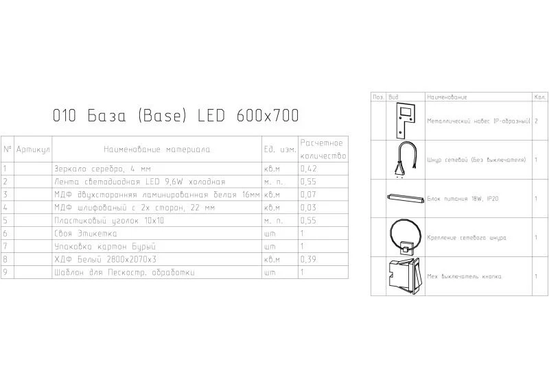 зеркало с подсветкой, комплект креплений, инструкция, гарантийный талон