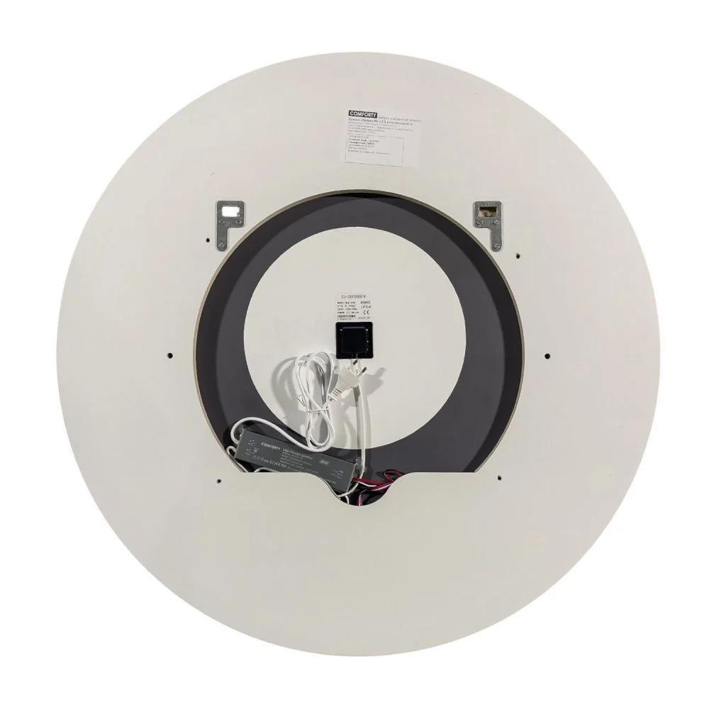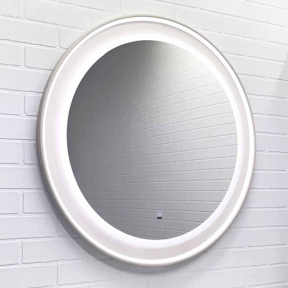 Высококачественное зеркальное полотно с амальгамой на основе серебра. Зеркало оборудовано ореольной и фронтальной Led подсветкой с бесконтактным включателем со встроенной функцией регулировки яркости. Температура подсветки: 6000-6500К холодная. Основа зеркала из МДФ фрезерована кантом по периметру и облицована в матовую пленку цвета "серый шелк".