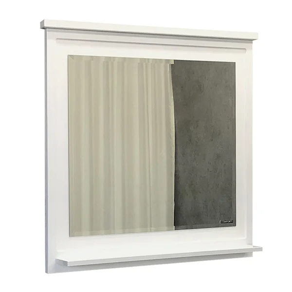 Зеркало для ванной комнаты с полочкой в обрамлении фигурной рамы из МДФ покрытого белой глянцевой эмалью. Высококачественное зеркальное полотно с амальгамой на основе серебра.