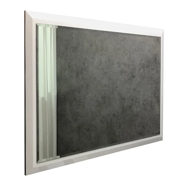 Широкое зеркало для ванной комнаты из коллекции Империя. Рама из МДФ окрашенного белой глянцевой эмалью. Фацет на зеркальном полотне и раме повторяется на выдвижных ящиках тумбы-умывальника.