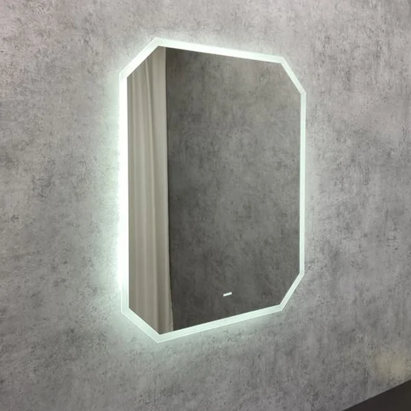 Зеркало оснащено встроенным светодиодным светильником размещенным по окружности и сенсором бесконтактного включения подсветки. Высококачественное зеркальное полотно с амальгамой на основе серебра. Изготовлено из зеркального полотна толщиной 4 мм производства ведущего европейского производителя зеркал AGC.