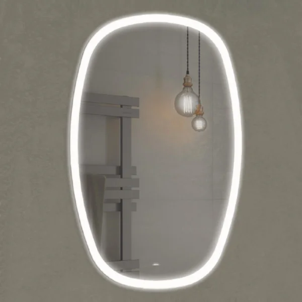 Зеркало оснащено встроенным светодиодным светильником размещенным по периметру и бесконтактным сенсором включения подсветки. Изготовлено из зеркального полотна толщиной 4 мм производства ведущего европейского производителя зеркал AGC.