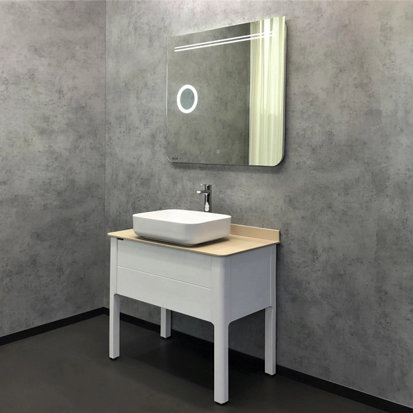 Зеркало оснащено встроенным длинным светодиодным светильником в верхней части, увеличительным зеркалом с круговой светодиодной подсветкой и бесконтактным сенсором включения подсветки. Изготовлено из зеркального полотна толщиной 4 мм производства ведущего европейского производителя зеркал AGC.