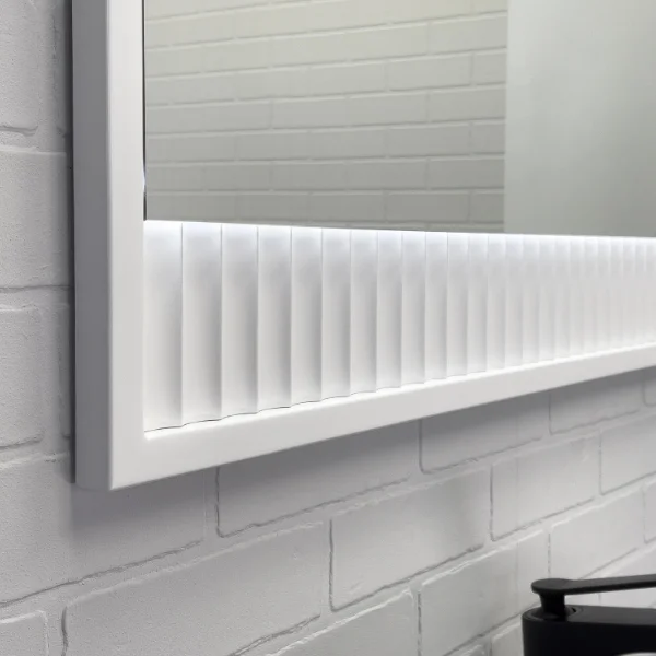 Зеркальное высококачественное полотно с амальгамой на основе серебра. Основа зеркала из МДФ фрезерована геометрическим узором с имитацией волны и окрашена белой матовой эмалью. Зеркало оборудовано светодиодной подсветкой с включением/выключением бесконтактным сенсором.