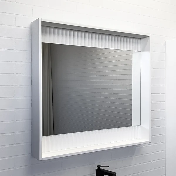 Зеркальное высококачественное полотно с амальгамой на основе серебра. Зеркало-короб оборудовано светодиодной контурной подсветкой с бесконтактным включателем.