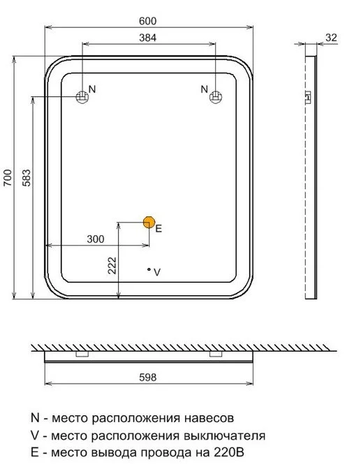LED лента по периметру подложки. Термообогрев (минимальной мощности) включается вместе с подсветкой. Сенсорный включатель. Фаска 4 мм по периметру. Упаковка: картон, пленка, пенопластовые уголки.