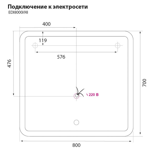 LED лента по периметру подложки. Термообогрев (минимальной мощности) включается вместе с подсветкой. Сенсорный выключатель. Фаска 4 мм по периметру. Упаковка: картон, пленка, пенопластовые уголки.