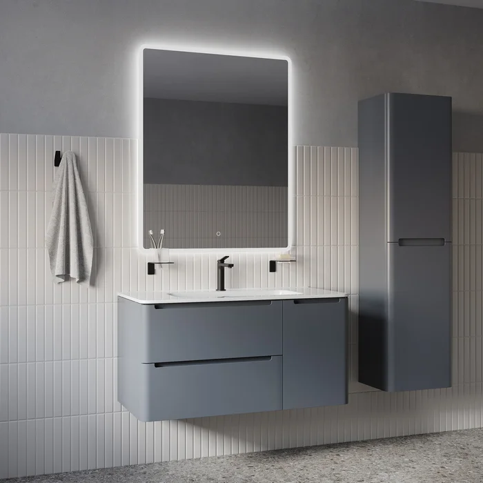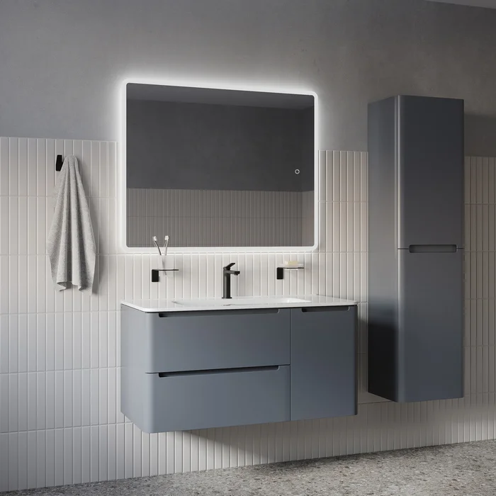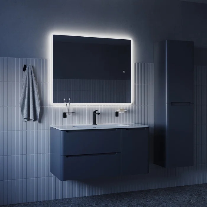 Большое стильное зеркало Uniq – продуманное универсальное решение для современной ванной благодаря возможности повесить его горизонтально или вертикально, а также трем цветам подсветки в одном зеркале – можно выбрать оптимальный по температуре: теплый (3 000 К), нейтральный (4 500 К) или холодный (6 000 К).