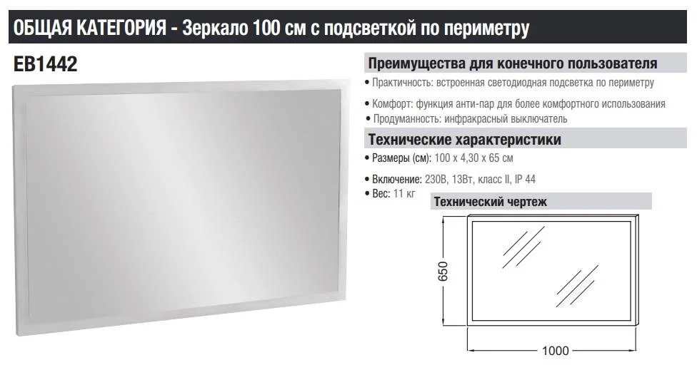 EB1442-NF 100х65см, зеркало, с подсветкой по периметру, с функцией анти-пар, Jacob Delafon