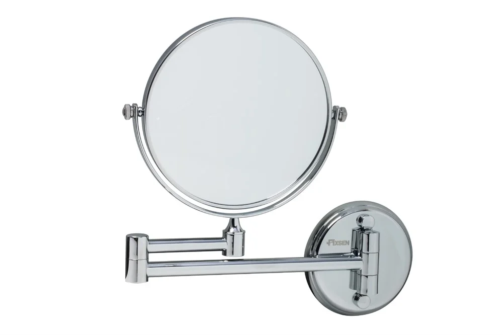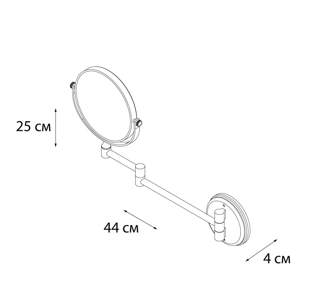 Настенное косметическое зеркало на двухсекционном кронштейне. Одна сторона зеркала без увеличения, другая сторона с 3-х кратным увеличением. Материал - нержавеющая сталь.