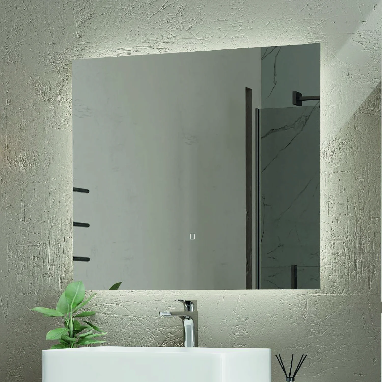 Яркость LED-подсветки регулируется при помощи встроенного диммера и сенсорной кнопки на поверхности зеркала.