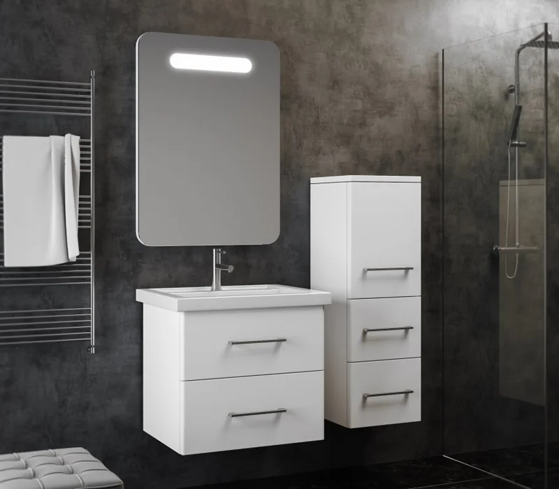 Подвесная тумба прямоугольной формы с изящной ручкой, двумя выдвижными ящиками с системой «плавного закрывания», глубокой керамической раковиной и зеркалом.