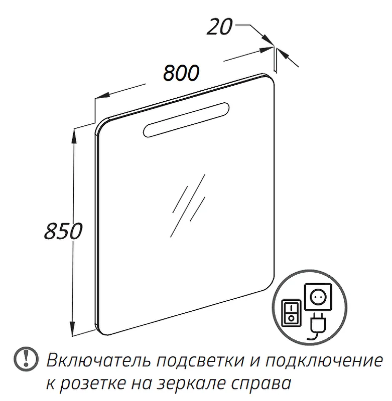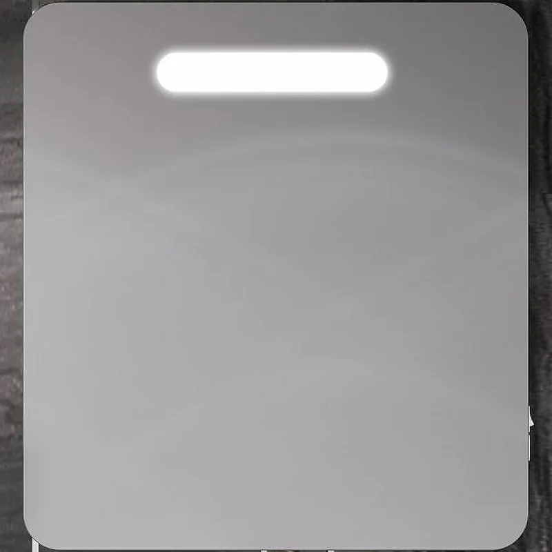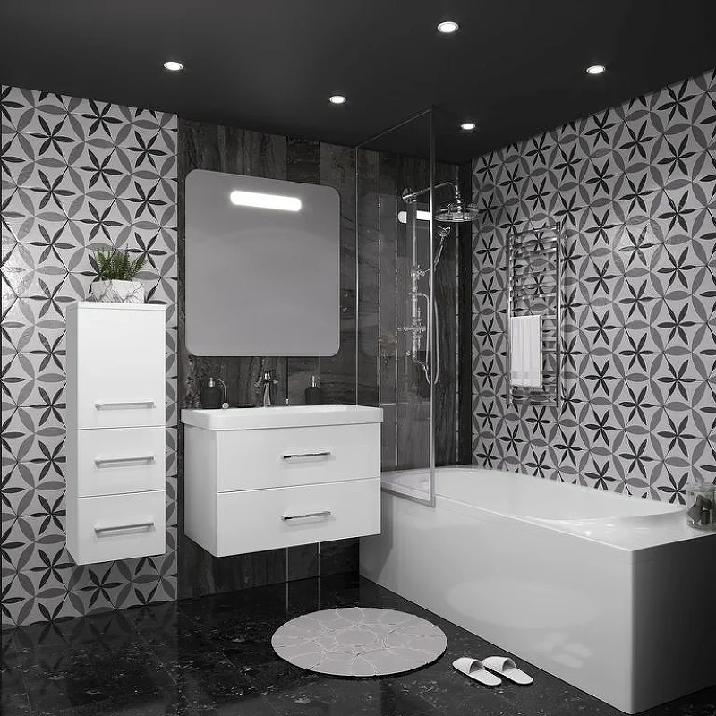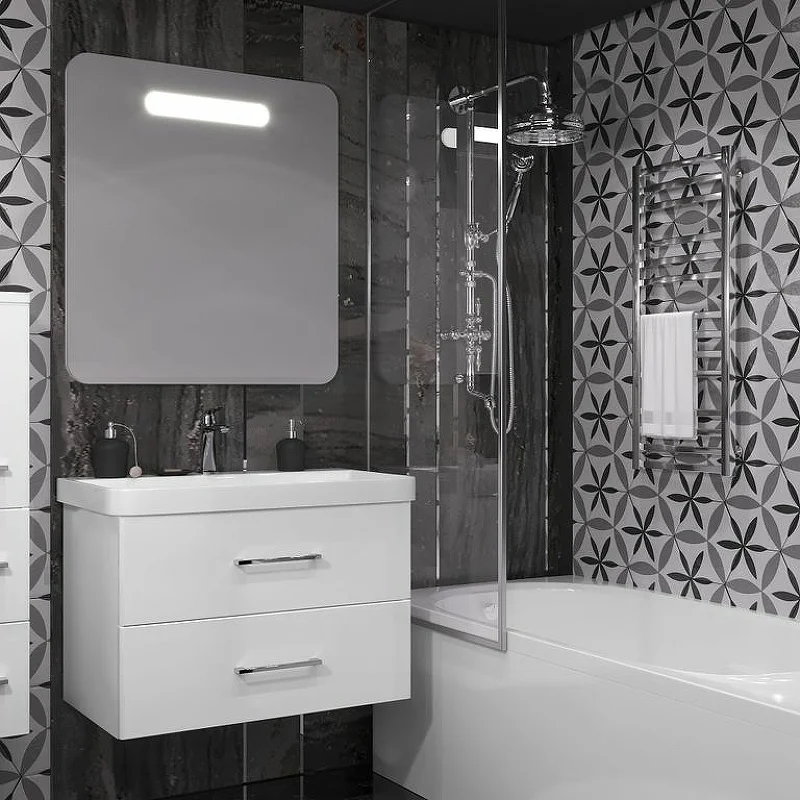 Подвесная тумба прямоугольной формы с изящной ручкой, двумя выдвижными ящиками с системой «плавного закрывания», глубокой керамической раковиной и зеркалом.