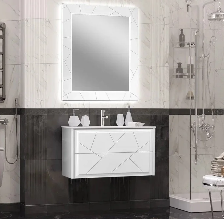 Коллекцию ЛУИДЖИ украшают сложная фрезеровка фасадов строгими линиями и декоративная подсветка по периметру зеркала, которое оснащено сенсорным выключателем. Тумбы дополняются современными ультратонкими керамическими слим-раковинами в размерах 70 см и 90 см.