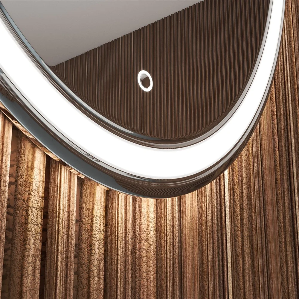 Система подсветки в зеркале осуществляется по периметру в соответствии с последними трендами в дизайне ванных комнат