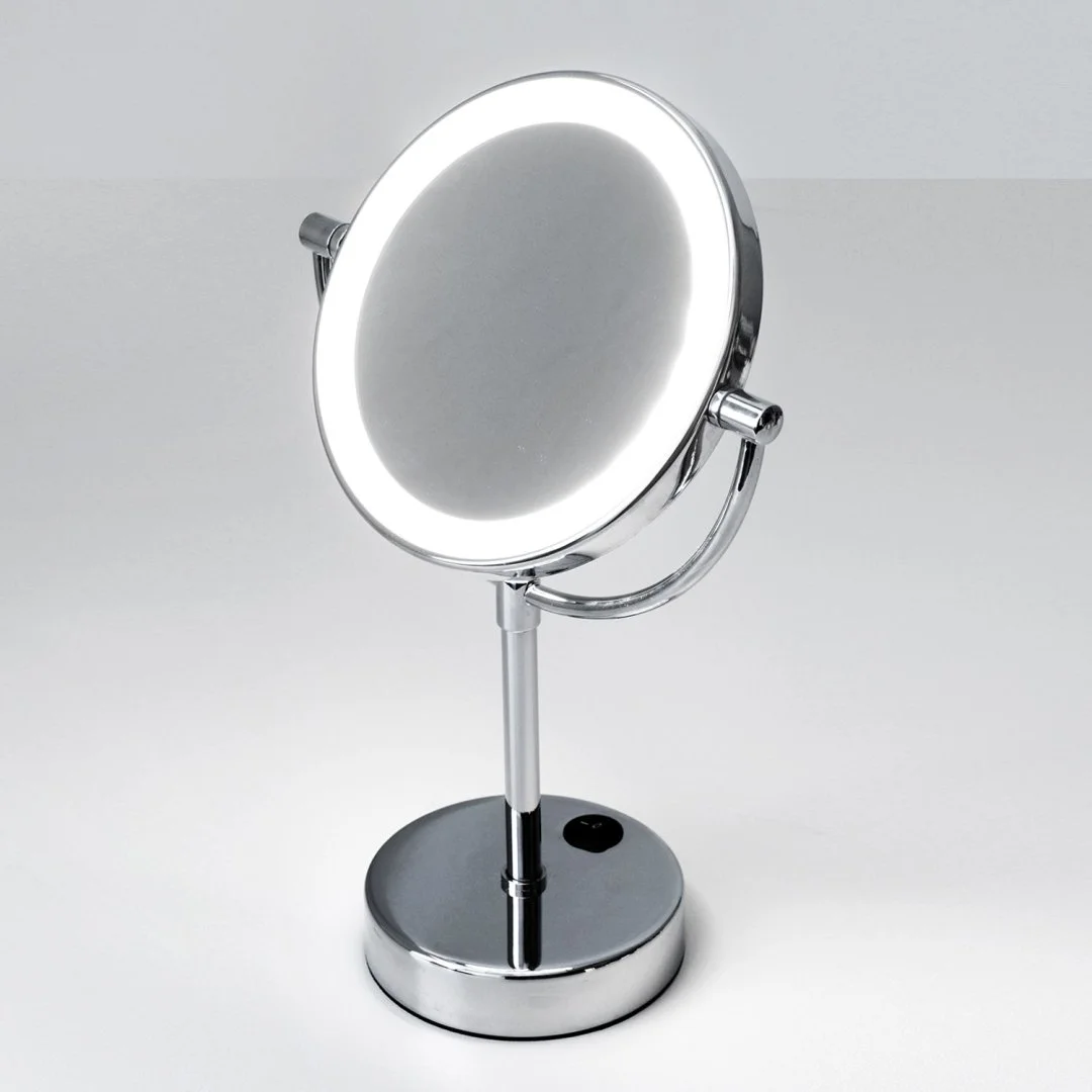 Зеркало является необходимым предметом в ванной комнате. Мы предлагаем двухстороннее зеркало (с одной стороны стандартное зеркало с другой стороны зеркало с 3-х кратным увеличением). Благодаря конструкции зеркала, вы можете его разместить так, как вам будет удобно. Зеркало вращается на 360 градусов по вертикали и горизонтали, что позволяет регулировать угол наклона зеркала и легко развернуть к себе нужной стороной. Также при помощи складной шарнирной ножки зеркало можно приблизить к лицу или убрать к стене.