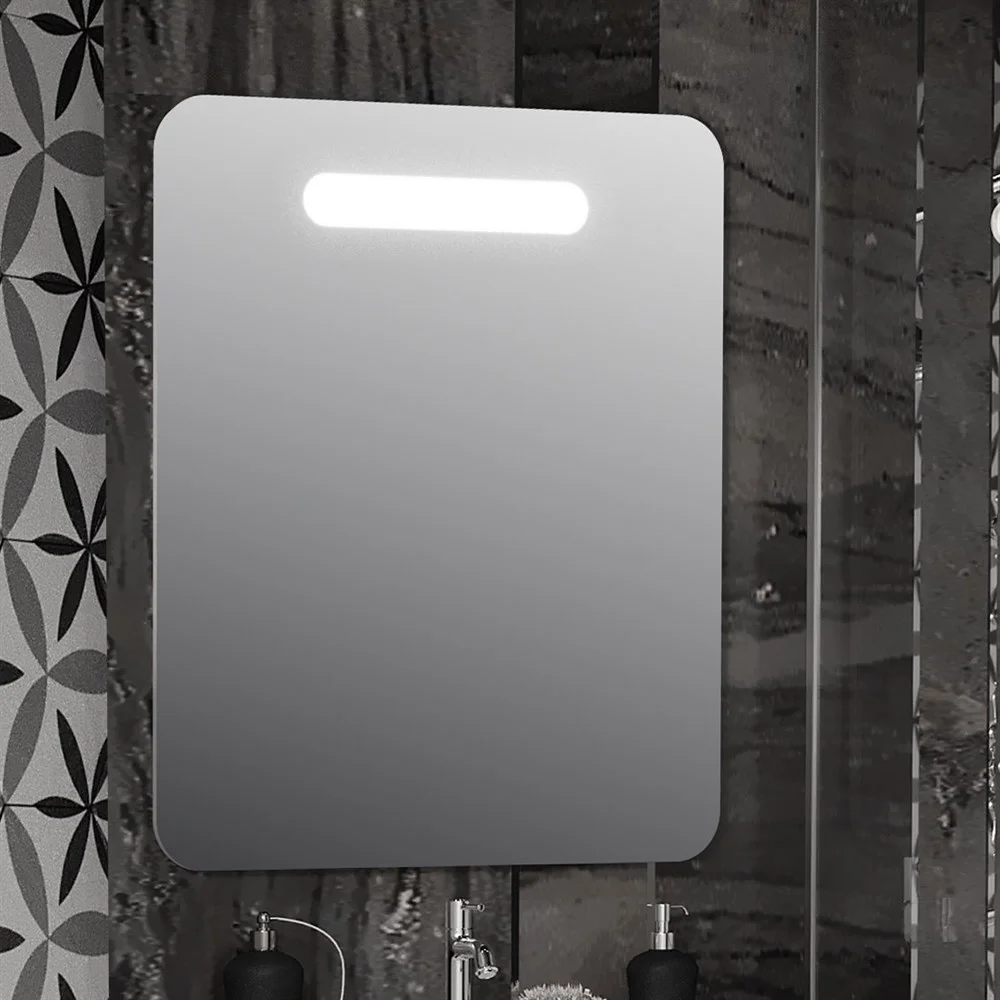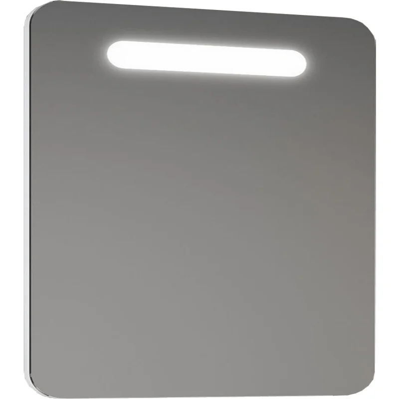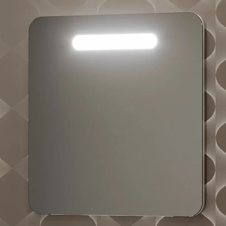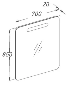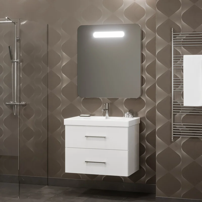 Подвесная тумба прямоугольной формы с изящной ручкой, двумя выдвижными ящиками с системой «плавного закрывания», глубокой керамической раковиной и зеркалом.