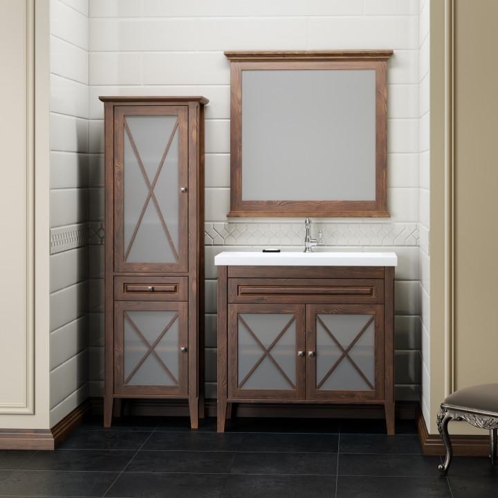 Коллекцию прекрасно дополняет высокий напольный пенал с дверцами с матовым стеклом и выдвижным ящиком.